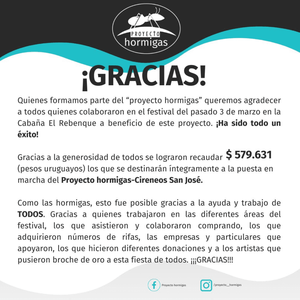 «Como las hormigas, esto fue posible gracias a la ayuda y trabajo de TODOS. Gracia a quienes trabajaron en las diferentes áreas del festival, los que asistieron y colaboraron comprando, los que adquirieron números de rifas, las empresas y particulares que apoyaron, los que hicieron diferentes donaciones y a los artistas que pusieron broche de oro a esta fiesta de todos» expresaron.