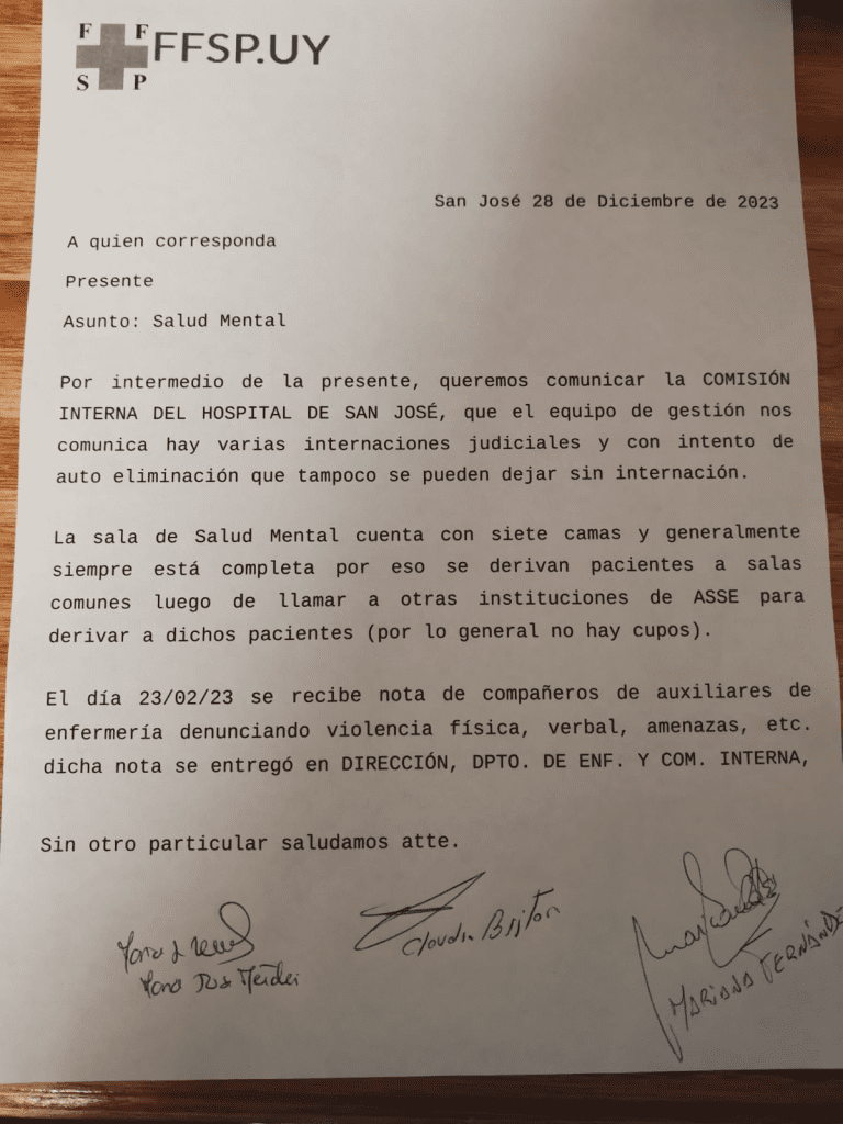 En su comunicado, además, la Comisión ratificó que uno de los factores que ha generado la situación está relacionado con el hecho de que la sala de salud mental «generalmente está completa». Debido a esto, «se derivan pacientes a las salas comunes luego de llamar a otras instituciones de ASSE para derivar a dichos pacientes» y recibir como respuesta que «no hay cupos».