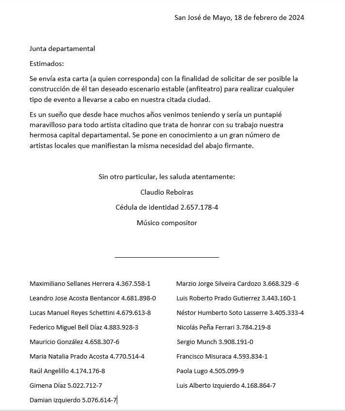 «Se envía esta carta (a quien corresponda) con la finalidad de solicitar de ser posible la construcción del tan deseado escenario estable (anfiteatro) para realizar cualquier tipo de evento a llevarse a cabo en nuestra citada ciudad«, señala la nota, que lleva la firma de una veintena de artistas.