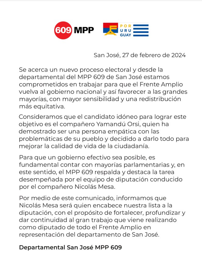 Paralelamente, la agrupación ratificó su respaldo a la candidatura de Yamandú Orsi a la presidencia de la República, dado que «ha demostrado ser una persona empática con las problemáticas de su pueblo y decidido a darlo todo para mejorar la calidad de vida de la ciudadanía».